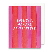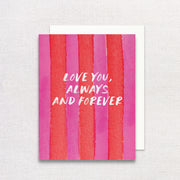 Say it like you mean it—with bold stripes and even bolder feelings. Featuring hand-painted watercolor stripes in pink and red, this greeting card reads “Love you, always and forever” in a white hand-written font. Whether you're shopping for a Valentine’s Day card for your partner or an anniversary card with lasting sentiment, this design hits the mark: warm, modern, and full of heart.