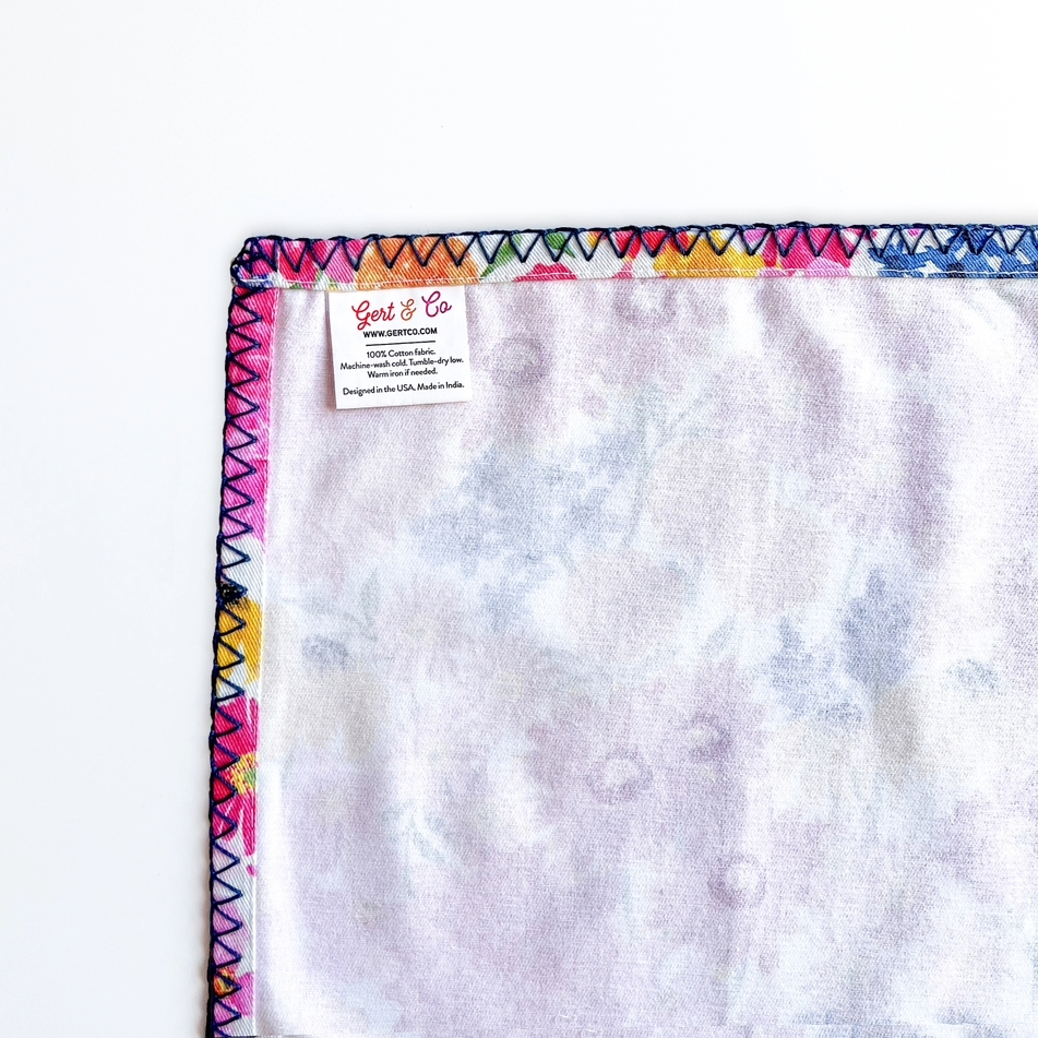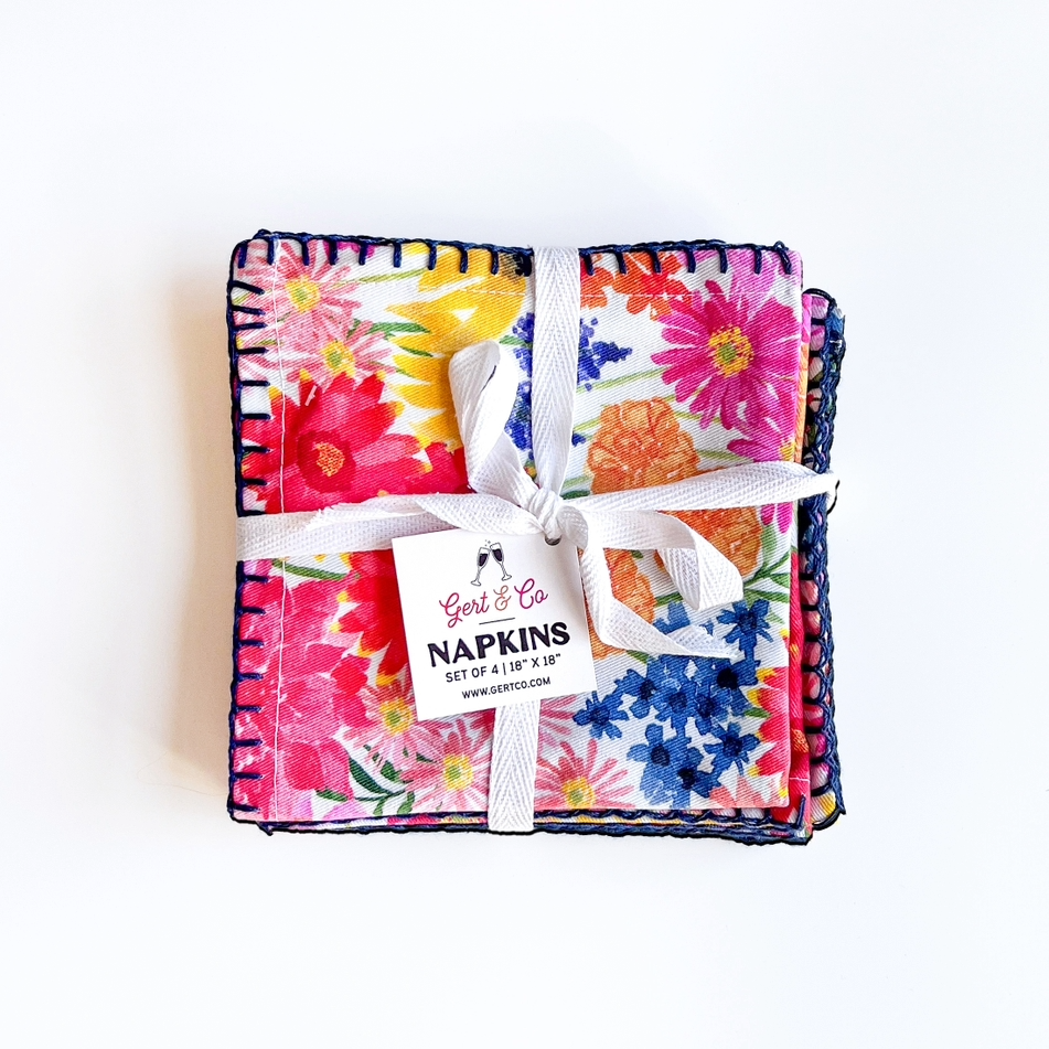 For the host who wants to create the perfect Summer table. This set of 100% cotton napkins brings floral charm to any meal, featuring bright watercolor flowers framed with a navy whipstitch embroidered edge. Created from an original watercolor painting, these playful yet polished napkins are perfect for summer entertaining, Easter dinner, or everyday dining that calls for a splash of color.