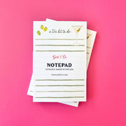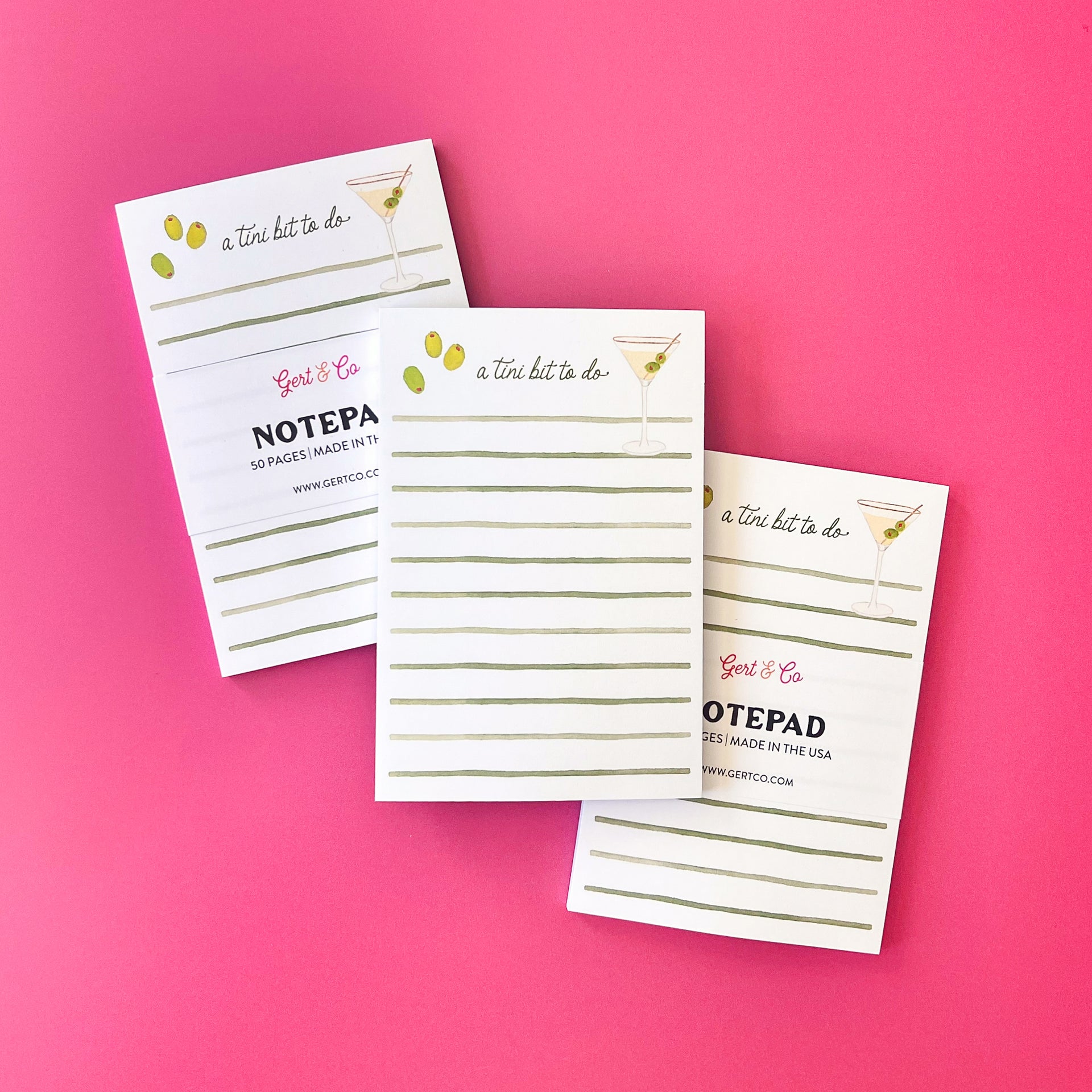 Make your daily lists a little more fun! This 50-sheet 4"x6" notepad features a hand-painted dirty martini and olives with the phrase “a tini bit to do” in a coordinating green script font. Completed with green watercolor lines, it’s perfect for jotting down tasks, shopping lists, or happy hour plans.