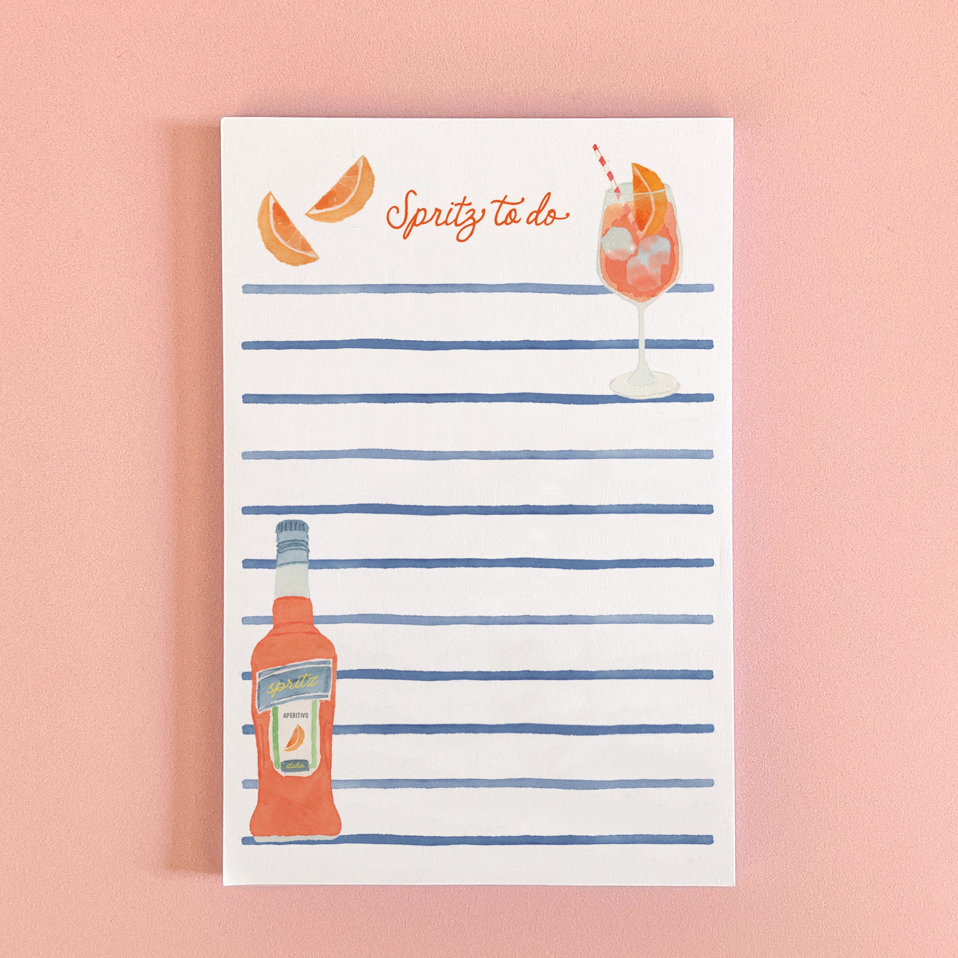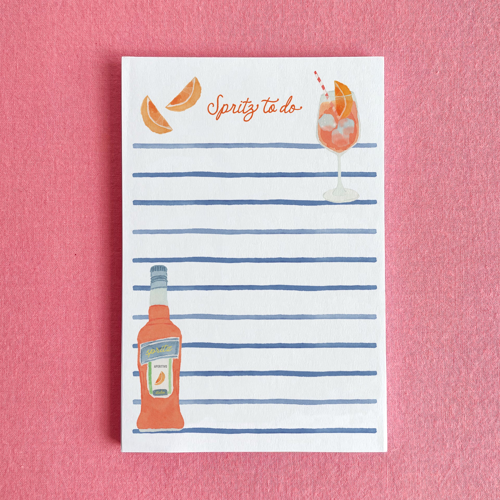 This playful, 50-sheet notepad features watercolor blue lines with hand-painted illustrations of an Aperol spritz, orange slices, and a bottle of Aperol. Topped with the phrase “Spritz To Do” in orange script, it brings a lighthearted, cocktail-inspired twist to everyday list-making. Gift it to your happy hour friends or keep it for yourself - It’s perfect for jotting down groceries, reminders, or weekend to-dos (spritz included).