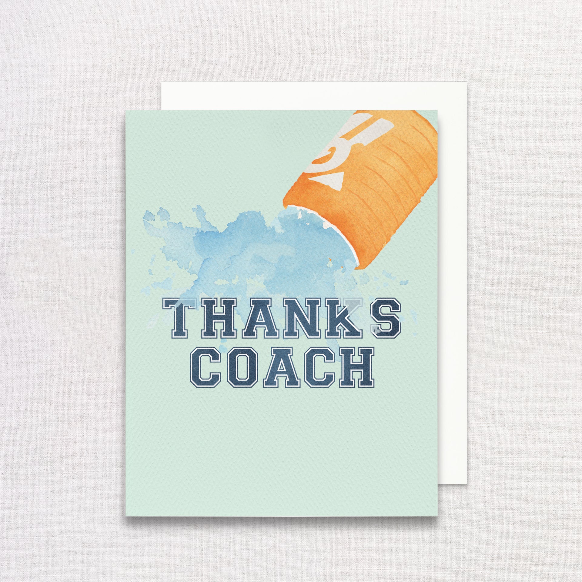 Celebrate the MVP of the season with this playful coach thank you card. Featuring navy varsity lettering and a hand-painted watercolor sports drink bath—just like a championship win—this card delivers appreciation with team spirit. Whether it's for the end of the season, a big win, or just because, it’s a fun and memorable way to say thanks to the coach who gave it their all.