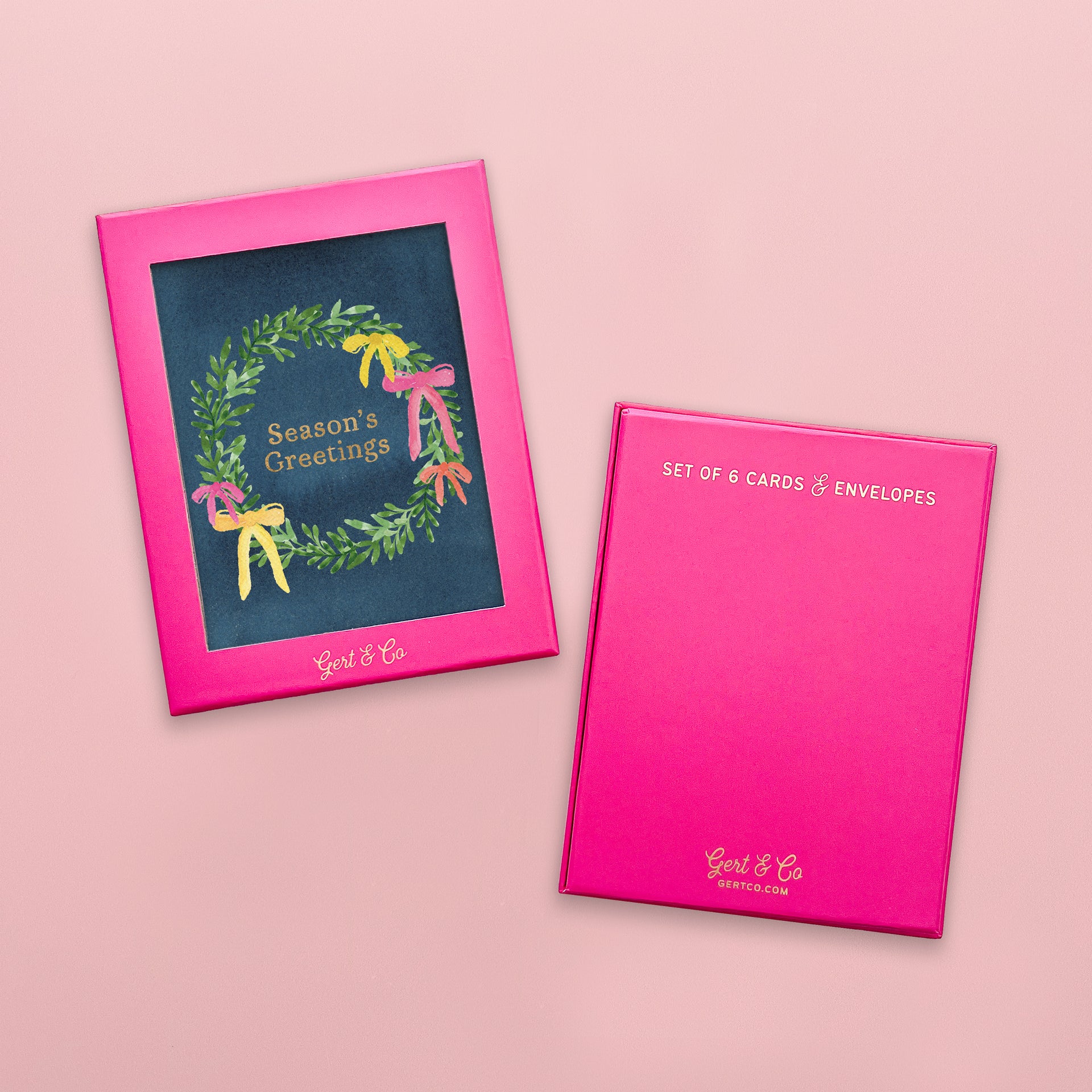 Send cheer with this boxed set of 6 whimsical holiday cards featuring a hand-painted wreath decked out in festive bows, all set against a rich navy background. Gold foil stamped with “Season’s Greetings” and packaged in a bright pink box with gold foil details, it’s a charming way to celebrate the season—perfect for spreading joy without leaning too traditional.