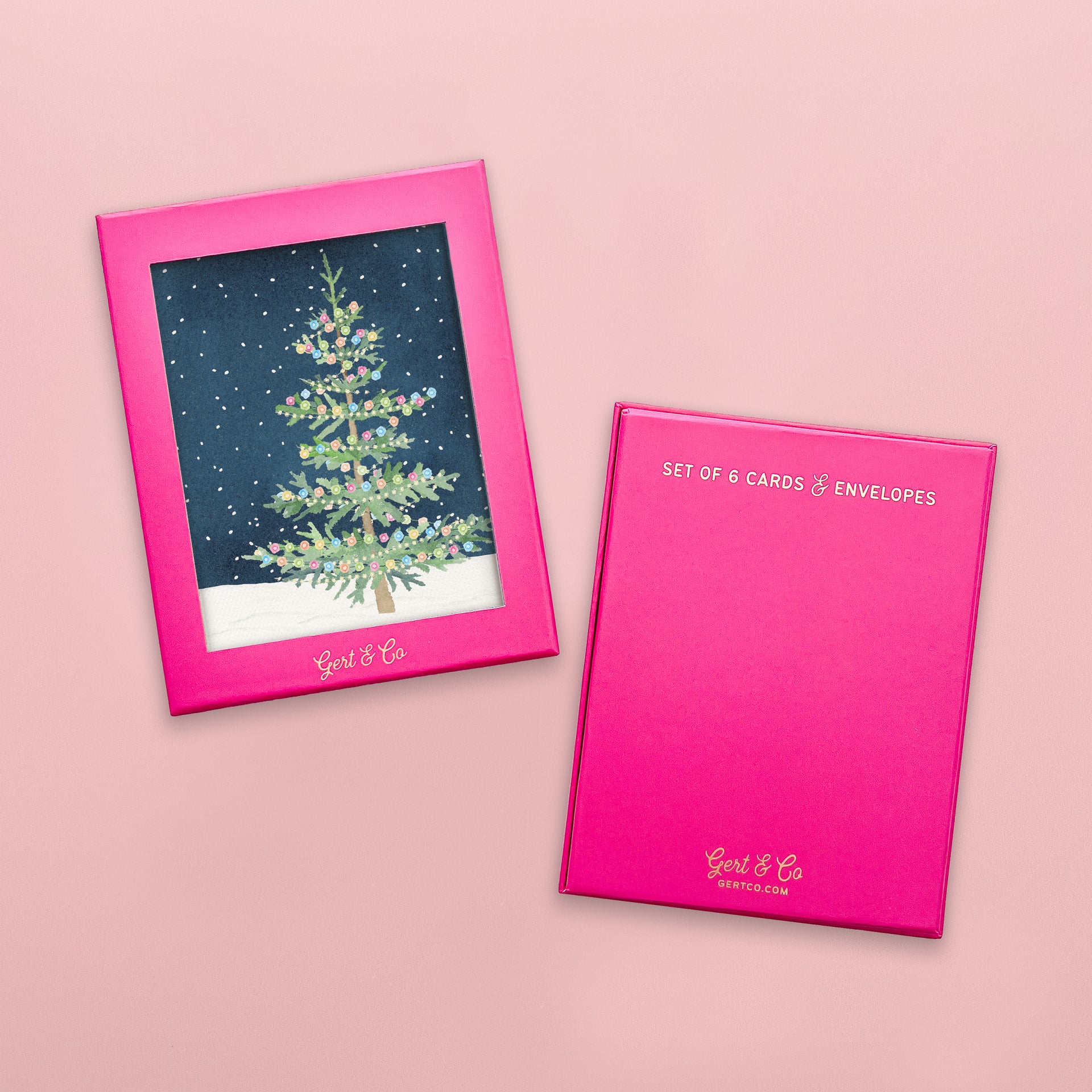 Capture the magic of the season with this boxed set of 6 whimsical holiday cards featuring a hand-painted Christmas tree glowing with colorful lights, surrounded by twinkling snow and set against a deep navy sky. It’s a joyful, snow-dusted scene that feels festive without being too traditional—perfect for spreading a little holiday cheer.