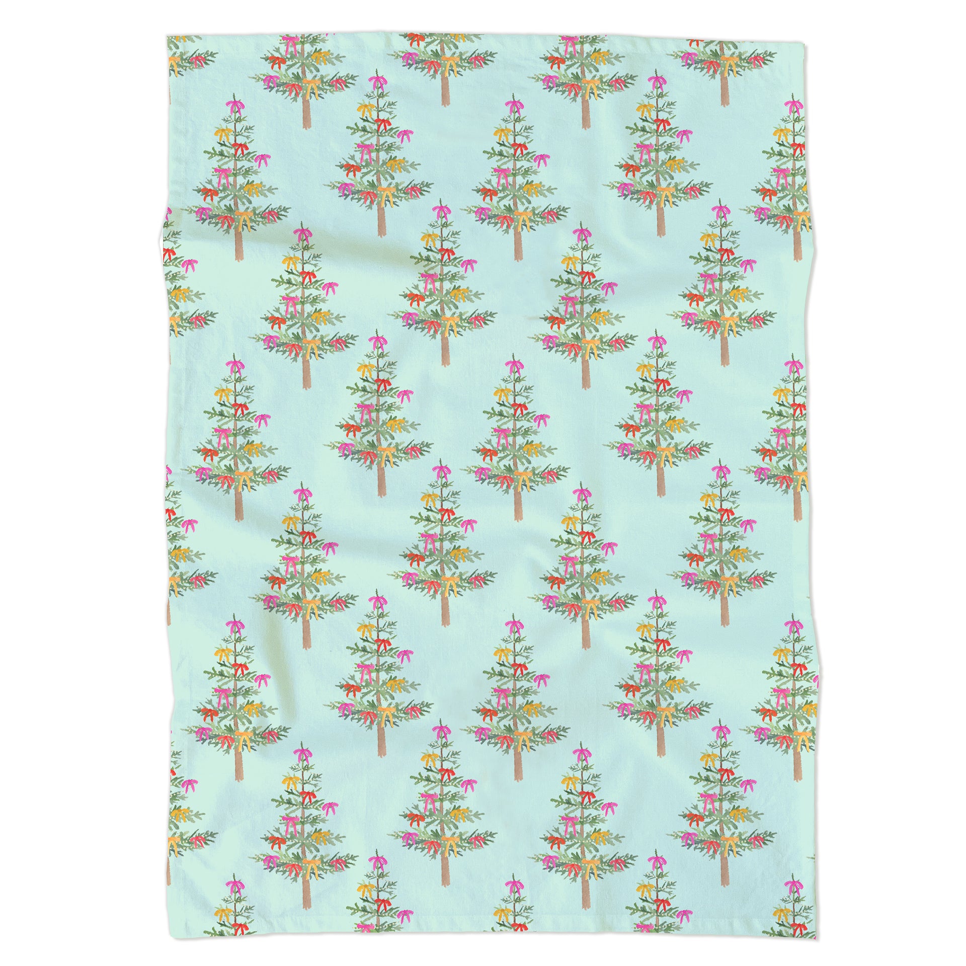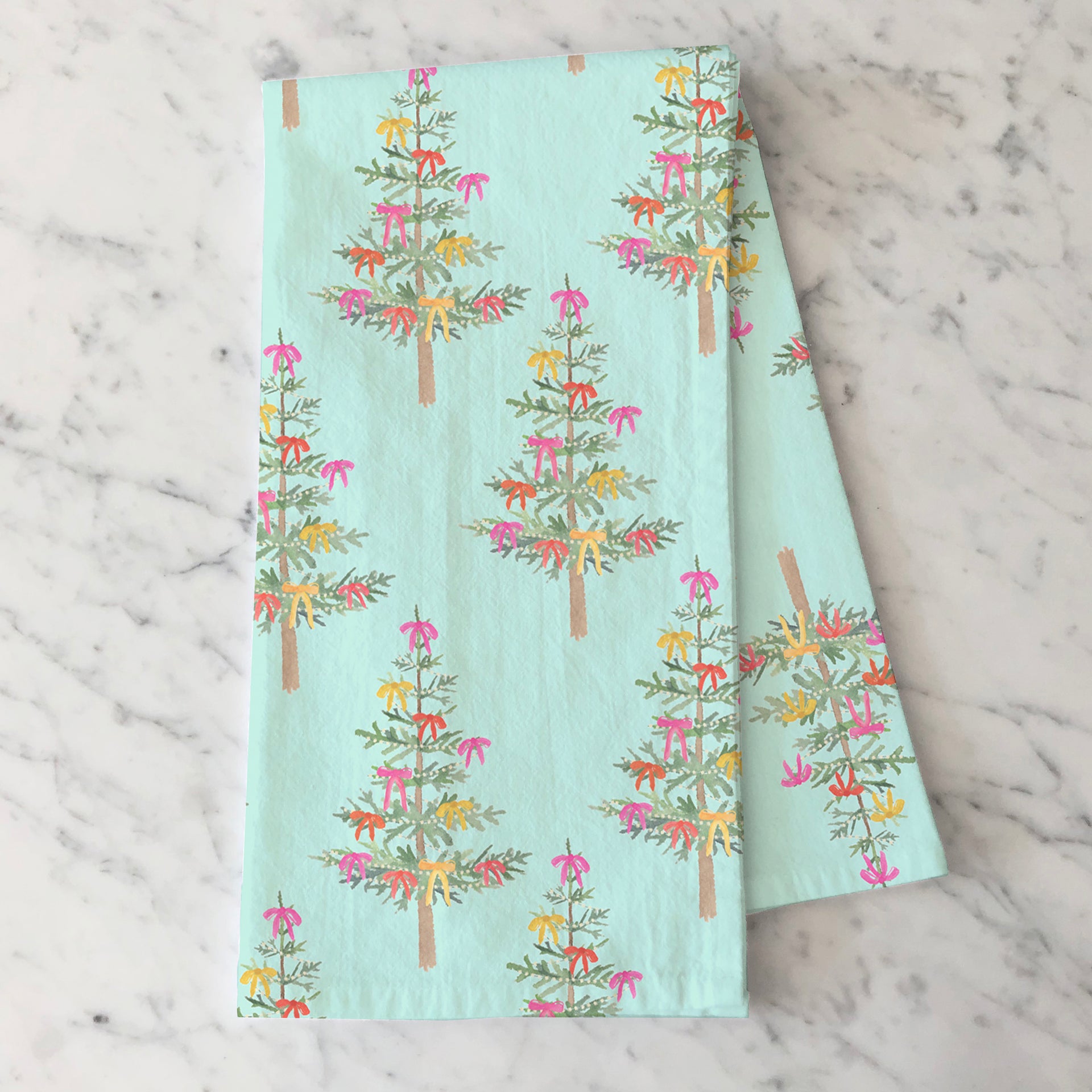 Bring festive fun to the kitchen with this holiday tea towel featuring hand-painted Christmas trees topped with sweet bows and glowing string lights—all set against a pastel blue-green background. Whimsical and bright, it’s the perfect way to add a splash of holiday cheer to seasonal hosting and gifting or brighten up your own holiday kitchen!