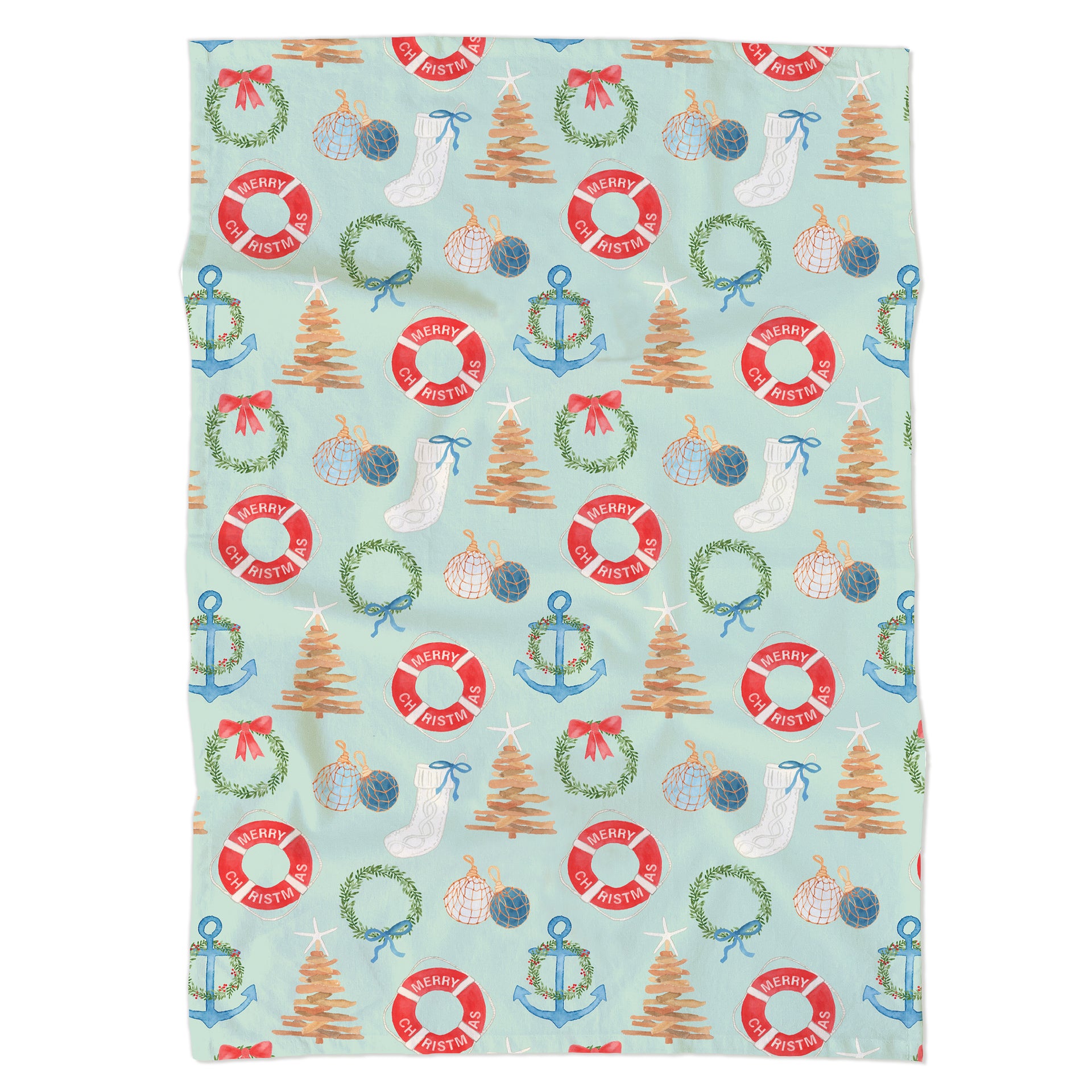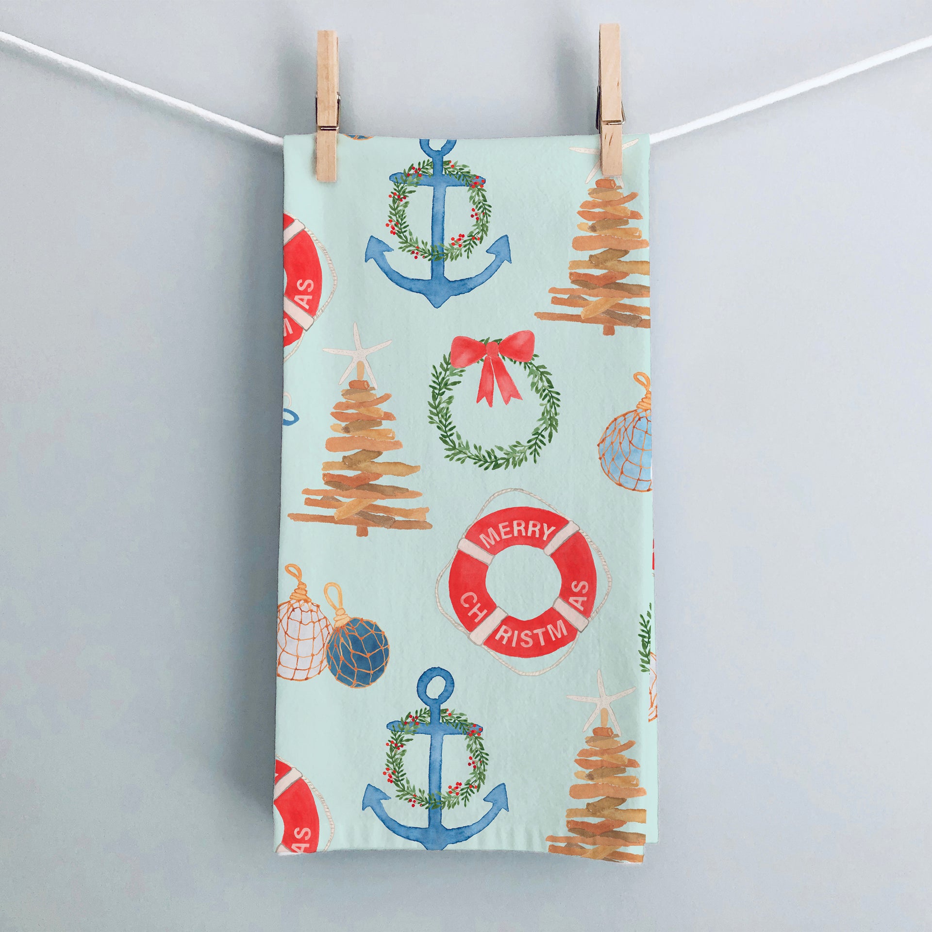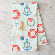 Celebrate the perfect coastal Christmas with this nautical holiday tea towel featuring festive icons with seaside charm. From a driftwood Christmas tree to a vintage red life preserver and an anchor wrapped in a holiday wreath, each hand-painted detail captures the spirit of the season—set against a blue-green background. A must-have for kitchens that love a splash of holiday cheer with a coastal twist.