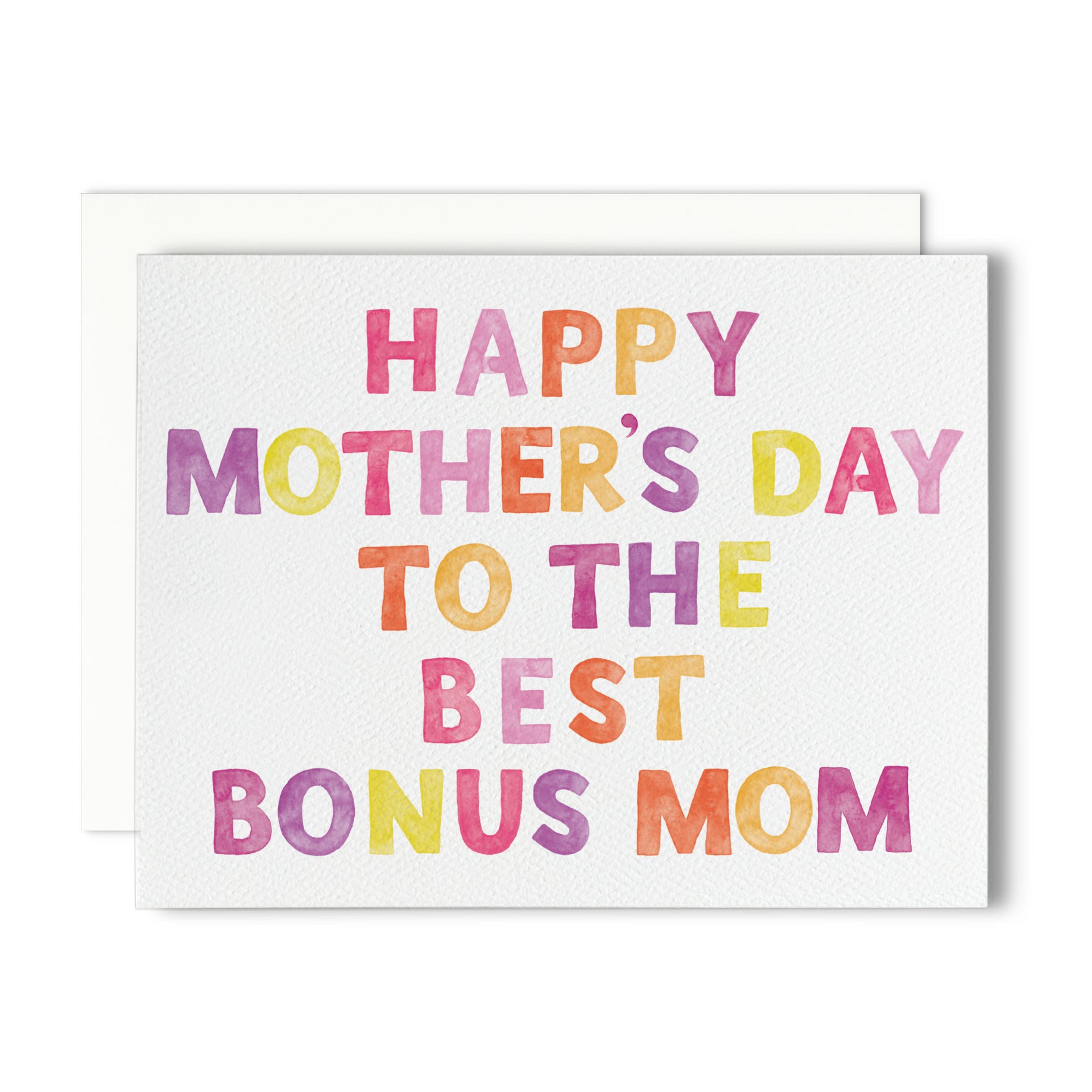 Say 'Happy Mother's Day' to the best bonus mom around! This Mother's Day greeting card is for the step mom who is like a second mom and features the phrase "Happy Mother's Day to the best Bonus Mom" in shades of pink, yellow, and orange.