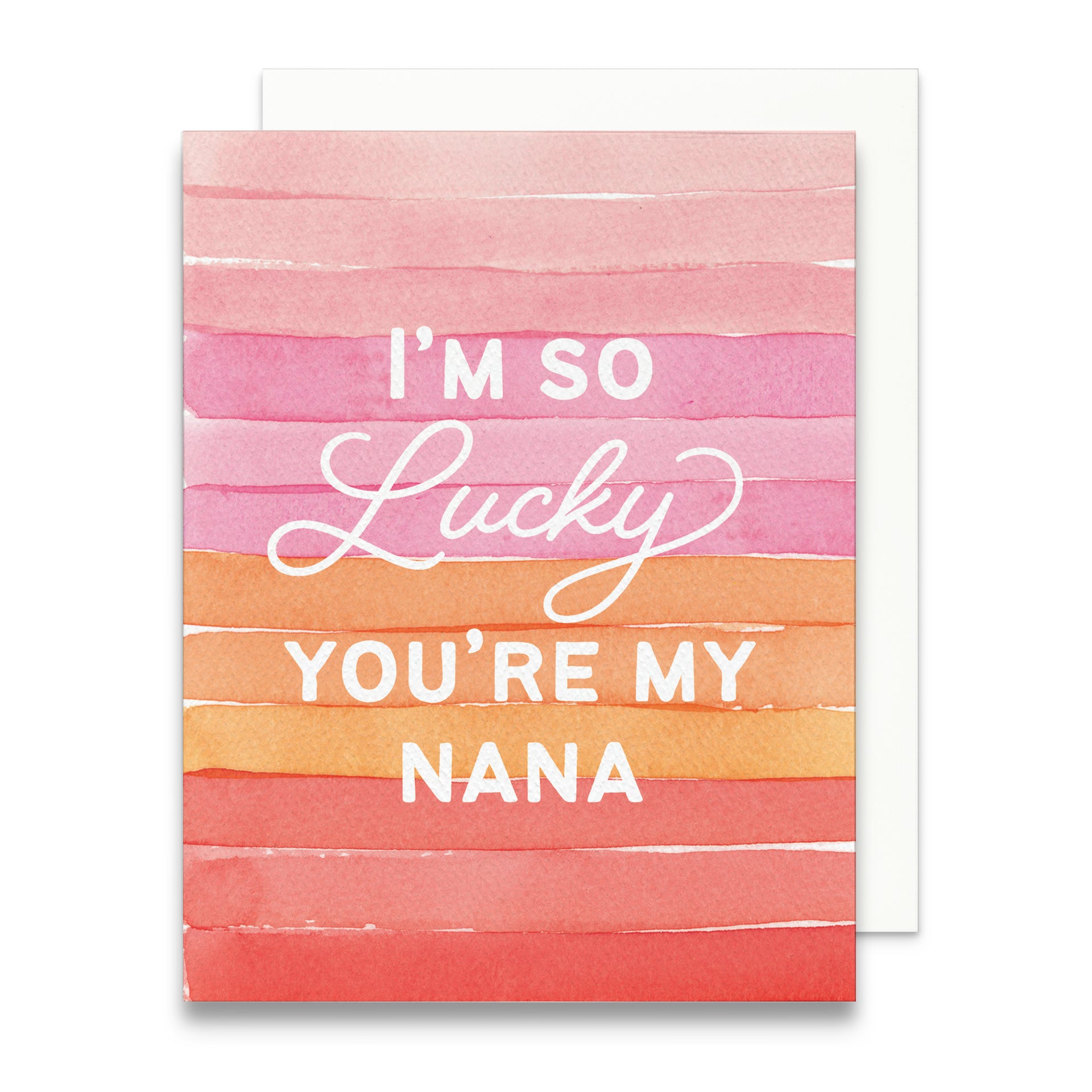 This colorful Mother’s Day card is for the Nana you feel so lucky to have. It features bold, hand-painted watercolor stripes in pink and orange with the phrase “I’m So Lucky You’re My Nana.” Bright, modern, and heartfelt, it’s the perfect way to thank grandma on Mother’s Day—or any day you want to remind her how fortunate you feel.