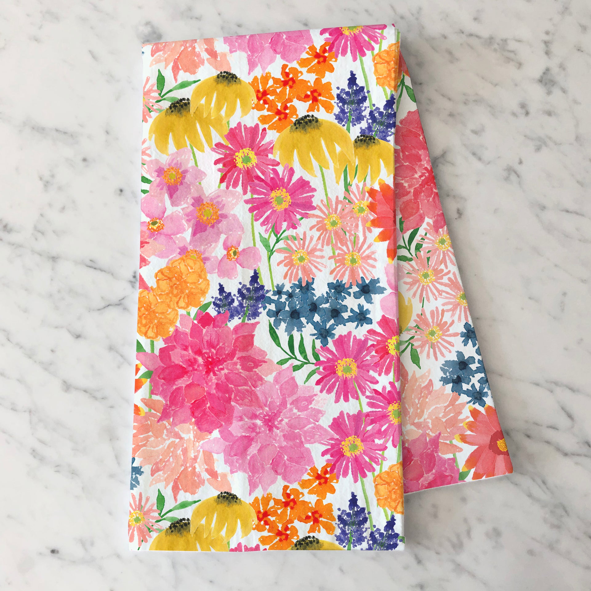 Add a cheerful pop of color to your kitchen with this flour sack tea towel featuring bright, hand-painted wildflowers. Created from original watercolor paintings, this kitchen towel is as functional as it is pretty—perfect for drying hands, wrapping baked goods, or simply hanging on display. Gift for Mother's Day, birthdays or to your favorite gardener.