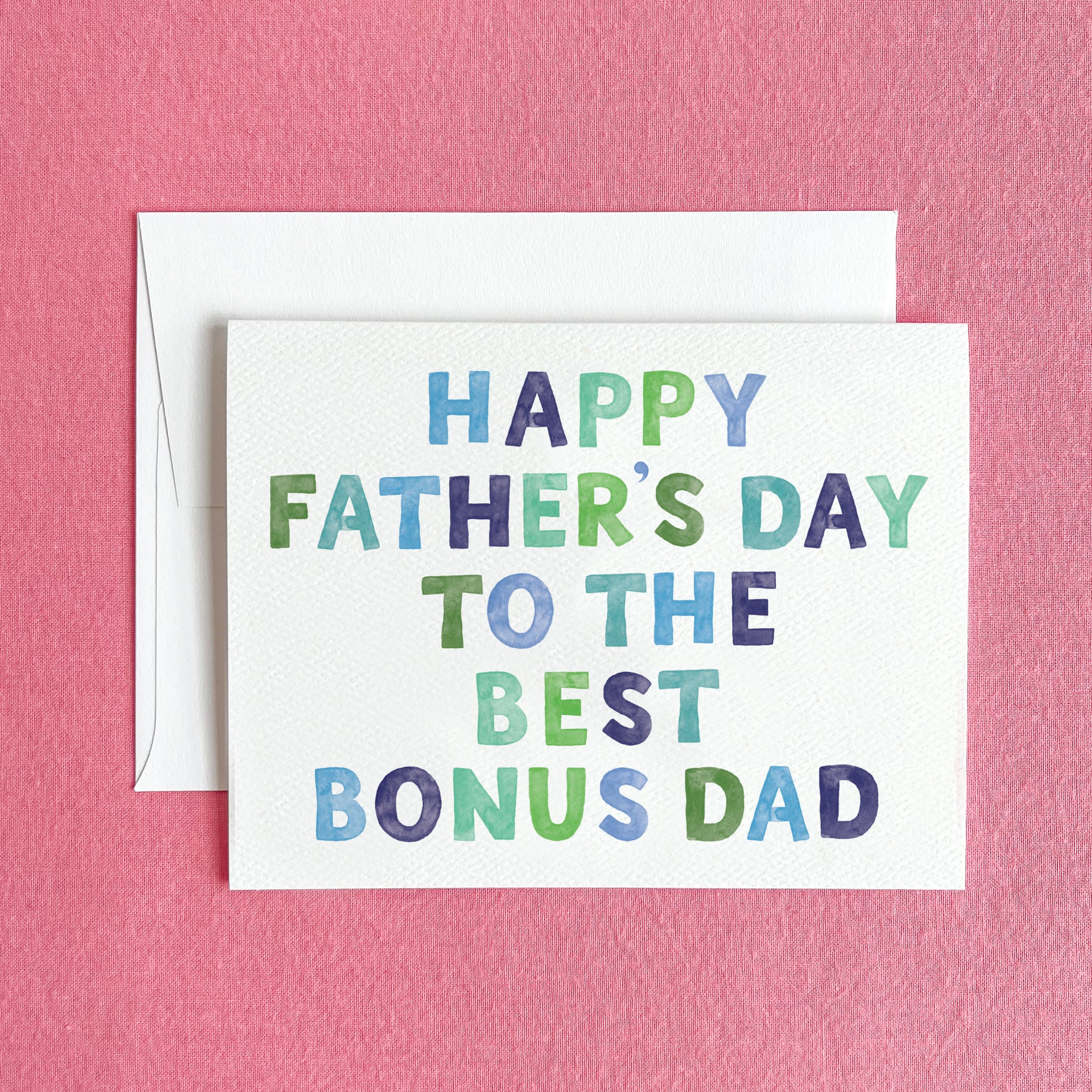 Say 'Happy Father's Day' to the best bonus dad around! This Father's Day greeting card is for the step dad who is really like a second dad and features the phrase "Happy Father's Day to the best Bonus Dad" in shades of blue and green.