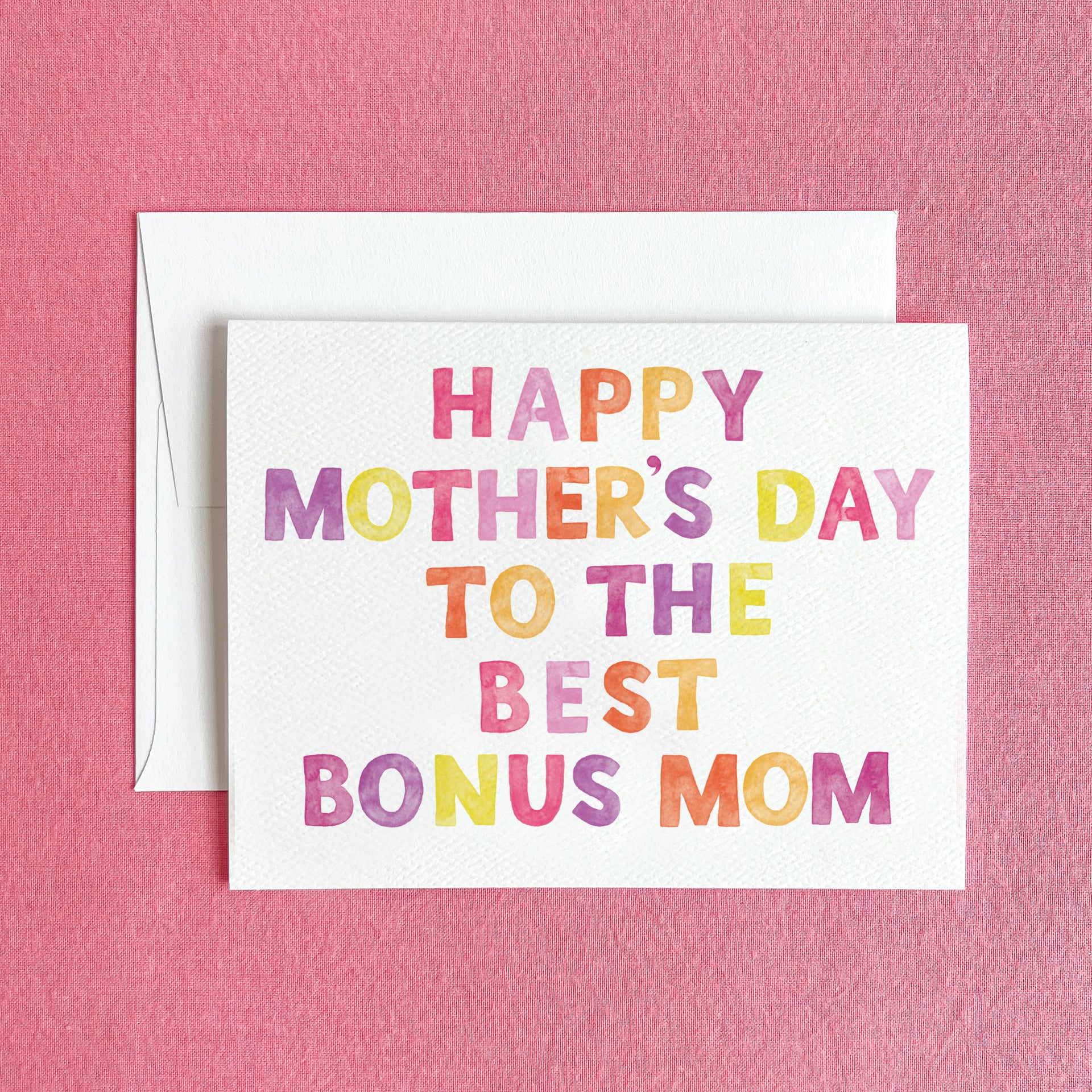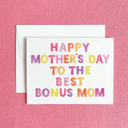 Say 'Happy Mother's Day' to the best bonus mom around! This Mother's Day greeting card is for the step mom who is really like a second mom and features the phrase "Happy Mother's Day to the best Bonus Mom" in shades of pink, yellow, and orange.